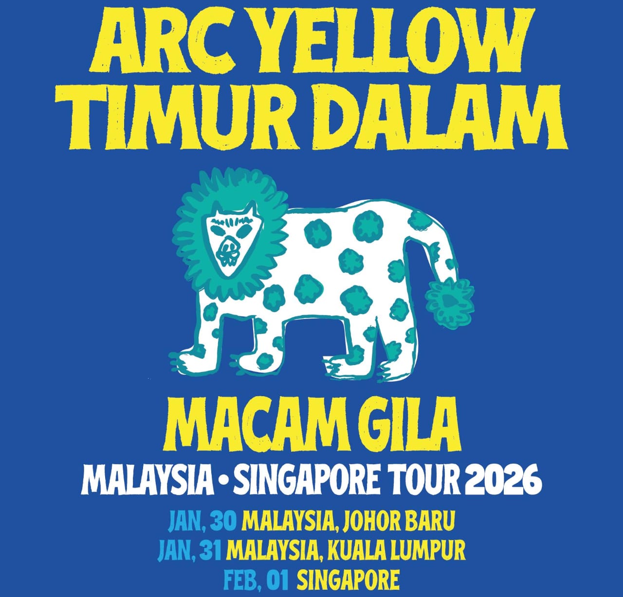 Tur bertajuk “Macam Gila Malaysia–Singapore Tour 2026” ini diumumkan melalui akun Instagram resmi masing-masing band, @arcyellow dan @timurdalam, pada Selasa, 23 Desember 2025.