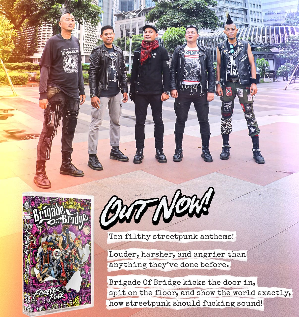 Jakarta – Setelah hampir dua dekade digilas ritme hidup: kerja, rumah tangga, domisili beda kota, hingga beda negara, rutinitas harian, kemalasan, dan segudang alasan klise yang seperti kutukan stagnasi untuk band punk lokal yang terbentuk di akhir 90an. Hampir mengendap jadi mitologi streetpunk Jakarta, Brigade Of Bridge menutup tahun 2025 dengan merilis album penuh ketiga mereka, Forever Punk, dalam format kaset melalui Toxic Noise Records dan Joe Pogo Records (Amerika Serikat) untuk pasar Indonesia.